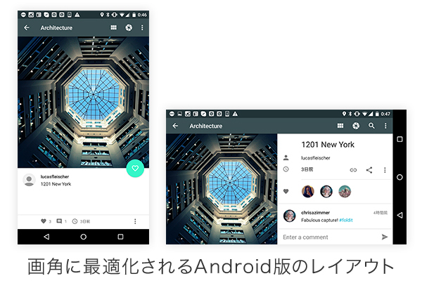 上記の画像はAndroid版のアプリの詳細画面だが、Portrait(縦向き)では縦のスワイプでコンテンツを読み進めるのに対し、Landscape(横向き)ではスプリットビューとなり、左右が独立して機能するようなレイアウトで表現され、画面サイズによって最適なレイアウトが採用されている。