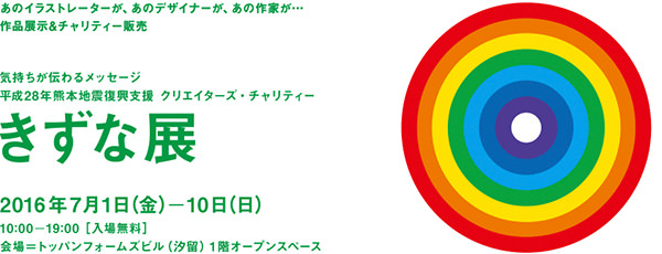 トッパン・フォームズ株式会社は、2016年7月1日(金)から7月10日(日)まで、トッパンフォームズビル 1F オープンスペースにて「きずな展」を開催する。平成28年熊本地震による被災者の支援を目的としたチャリティーイベント。企画の主旨に賛同したクリエイターが提供した作品を展示販売し、売上金は全て日本赤十字社を通じて震災復興支援の義援金として寄付される。入場無料で、時間は10:00〜19:00。