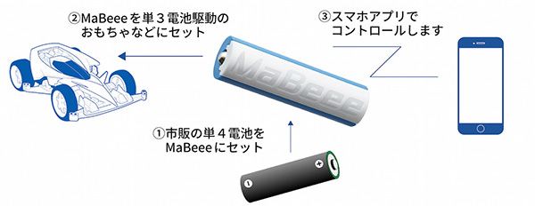 電動玩具などの製品をスマホで遠隔制御できるようになる乾電池型のIoT製品「MaBeee」