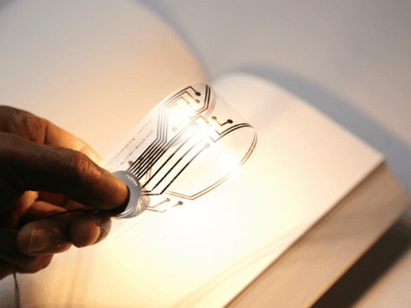 薄型のLEDが光る仕組みは、リチウム電池CR2032(別売り)のプラス・マイナス面をしおりで挟み込むことで、フィルムに埋め込まれたナノ粒子インクに電気が流れるから。点灯させるには、リチウム電池を用意してから手で持っていないといけないので、読書灯としてずっと使うのは非現実的だが、基板丸見えのスケルトン的な美しさとライトという機能を併せ持つスタイルは、ガジェットとして非常に魅力的である。