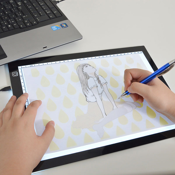 同製品は、厚さが5mmの超薄型トレース台。光源はLEDなのでライトのちらつきがなく、発熱も気にならない。明るさは無段階調節で、電源ボタンの長押しで調整できる。電源はUSB接続のため、PCのUSBポートやUSB充電器から給電できるほか、モバイルバッテリーで給電すればカフェなど外出先での作業も可能だ。