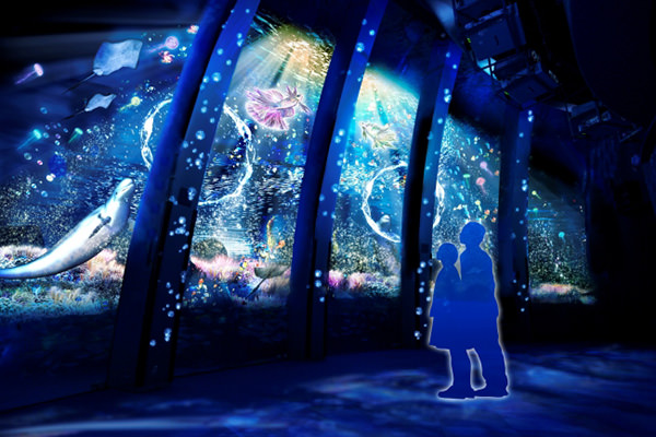 特に注目のコンテンツは、5万尾のイワシの大群を鑑賞できる大水槽「群れと輝きの魚たち」を舞台に、プロジェクションマッピング映像が融合したパフォーマンスを堪能できる「THE OASIS 〜FULL MOON PARTY〜」。“月と星が輝く夜の海”をテーマとしており、ブルーを基調とした幻想的な映像が投影された大水槽で、映像のイワシと本物のイワシたちが群れを成して舞い踊る。