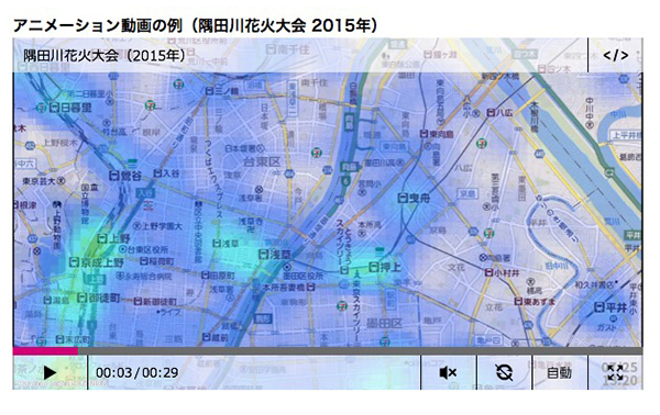 本機能は、エリアや施設周辺の過去3時間分の混雑度推移を地図上から確認できる「混雑レーダー」機能を使い、昨年の花火大会の混雑度の推移をアニメーション動画で確認できるもの。