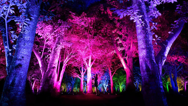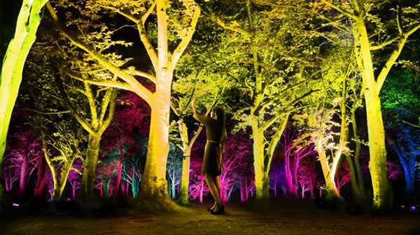 近くを通ると木々のライトアップが変化して音色が響く「チームラボ 宇部市ときわ公園 呼応する森」