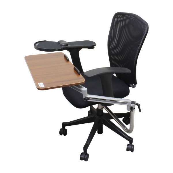 同製品は、オフィスチェアの支柱に取り付けられるノートPCテーブル。テーブルを支えるアームは2間接になっており、それぞれの間接が左右360度に回転する。高さの調節も可能で、テーブルを使いやすい位置に固定できる。テーブルを使わないときは、横にずらしておくこともできる。
