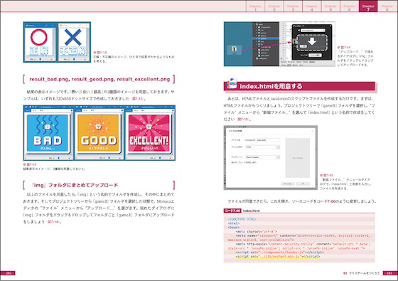 とにかく基礎的な情報がわかりやすく掲載されており、JavaScript、ゲームエンジン「enchant.js」、データベース、ハードウェアセンサーという、スマホゲーム開発に必要な知識を、ゲームをつくる楽しみをジワジワと感じとれる。ほかサンプルゲームのMonacaプロジェクトデータ、m7kenji氏による愛らしいドット絵イラスト素材もダウンロードで提供している。