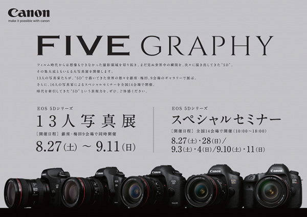 キヤノンマーケティングジャパン株式会社は、2016年8月27日(土)より、フルサイズ一眼レフカメラ「EOS 5D」シリーズの魅力を紹介するイベント「FIVE GRAPHY」を開催する。総勢13名の写真家による「FIVEGRAPHY EOS 5Dシリーズ13人写真展」を、9月11日(日)まで銀座と梅田の計9カ所のギャラリーで一斉に開催。そのほか、全国14カ所の会場で、16名の写真家が「EOS 5Dシリーズ」の魅力を語る予約不要 / 入場無料のスペシャルセミナーも順次開催される。