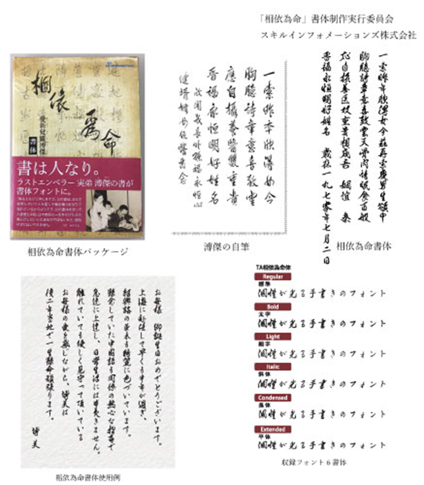 本製品は、溥傑の次女である福永嫮生さんが保管していた溥傑の書を元にした日本語毛筆フォント。「相依為命書体」とは、溥傑が生涯大切にしていた言葉であり、「家族、夫婦、隣人同士など、お互いの幸福を願う気持ちがあれば生きていける」という意味。