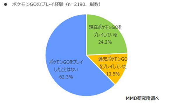 まず、「ポケモンGO」のプレイ経験については、現在プレイしている人は24.2%となった。ゲームを止めてしまった人は13.5%となり、プレイ経験者の約1/3が「ポケモンGO」から離れていることがわかった。