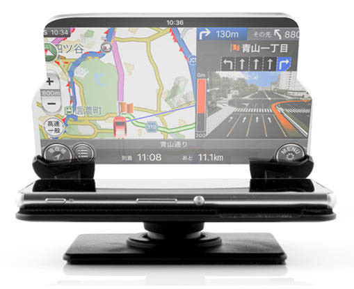 「HUDWAY GLASS」は、車のダッシュボードに設置してスマートフォンを置くだけで、スマートフォンの画面を鏡のように映して、HUDとして利用できる製品。スマートフォンの画面に比べて約1.2倍に拡大されるとともに、透過性のある画面でドライバーの前方の視界を妨げることがないため、目線の移動を最小限にして、安全にカーナビアプリを利用できる。