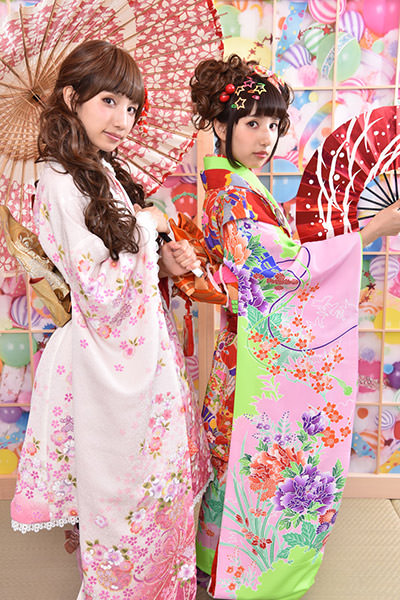 「もしもし着物サロン」では、着物を原宿スタイルにアレンジした色鮮やかな衣装に着替えて記念撮影できるサービスを提供。当日中に写真データやプリントを受け取れるライトなコースから、写真加工データやアルバムを後日納品してもらえるこだわりコースまで用意されている。店内写真撮影と写真データ(CD-R)のベーシックコースは1万円(税抜)。ベーシックコースへのヘアセットとメイクの追加はオプションで、計1万7000円(税抜)となる。さらにアルバム印刷や画像データ加工(1枚)を含めたフルコースは2万5000円(税抜)だ。