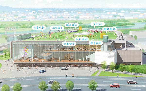 アートとデザインという2つの大きな軸を持つ新しい富山県美術館は、株式会社内藤廣建築設計事務所が設計を担当。建物の屋上には芝生広場が広がり、ふわふわ、ぐるぐる、ひそひそなど、多くの“オノマトペ”で溢れた遊具が設置される。これらは佐藤卓氏がアートディレクションを手掛けたものだ。また、新しいロゴマークとロゴタイプの制作は永井一正氏が担当。TOYAMAの頭文字である「T」をベースにアートのAとデザインのDで構成されており、富山の自然の美しさも内包した表現となっている。