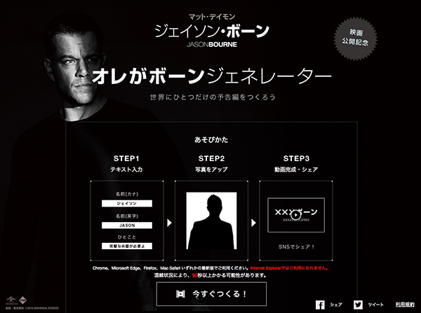 映画『ジェイソン・ボーン』の公開を記念した特設サイト「オレがボーンジェネレーター」がオープンしている。