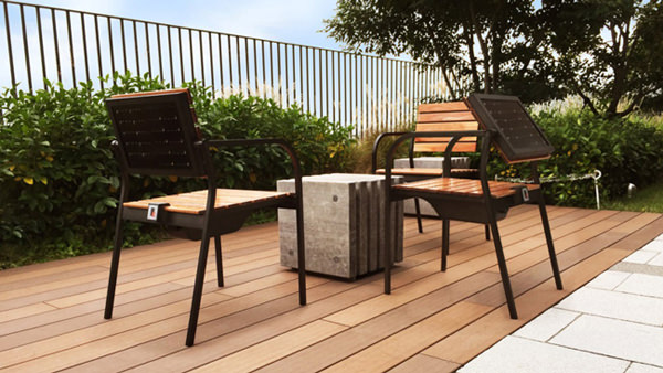 同製品は、「ソーラー充電スタンド」は、背もたれの裏側に、人工衛星などに採用されている高効率な化合物太陽電池を搭載した椅子型の充電スタンド。約30%の高い変換効率を実現しており、テラス席など屋外に設置することで効率良く発電できる。利用者は座ってコーヒーを飲みながら、手軽にスマートフォンなどを充電することが可能だ。