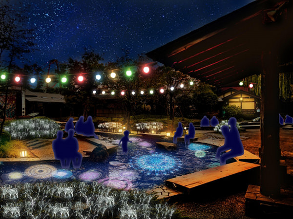 足湯の水面にプロジェクションマッピングで花火を投影する「大江戸温泉 花の宴」