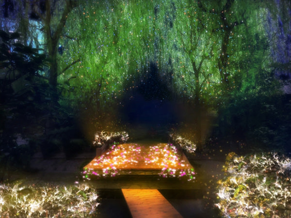 「東京お台場 大江戸温泉物語」において、700坪の広大な日本庭園に広がる全長50mの足湯は、風景を味わいながら浴衣のまま楽しめる人気スポットだ。本イベントでは、足湯へ向かう橋へのプロジェクションマッピングやイルミネーションでも「花の宴」をイメージした演出が行われる。桟橋の上には“花びら”が舞い散り、足湯エリアは光ファイバーで作られたフラワーイルミネーションで装飾。このイルミネーションは足湯を囲むように配置され、幻想的な雰囲気が実現された。メインコンテンツとなる足湯花火のプロジェクションマッピングは、伝統的な花火の美しさに、万華鏡をモチーフとした輝きを融合させている。
