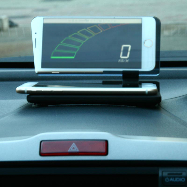 同製品は、スマートフォンを置くだけでナビアプリやスピードメーターのアプリが見やすくなる、車載スタンド式のヘッドアップディスプレイ。付属の滑り止めマットをダッシュボードに敷いて本体を設置し、HUD対応アプリを表示させたスマートフォンを置くだけで使用できる。