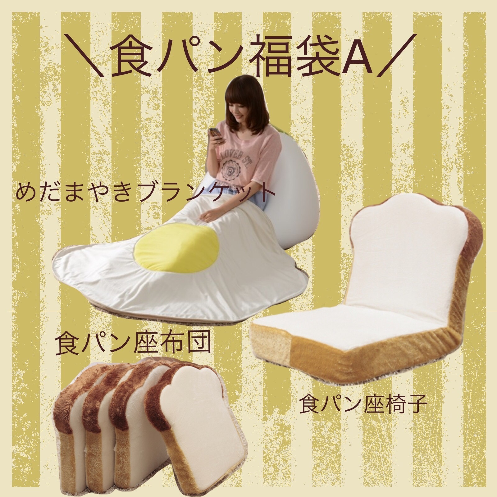 低反発クッションに5段階リクライニングのふかふか座布団や、触り心地抜群のめだまやきブランケット、ちょっと厚めな4枚切り食パン座布団はカバーをかけることで1斤に変身し、机やオットマンとしても活用が可能。福袋は今回も争奪戦必至。予約は2017年1月1日より開始され、2017年1月中旬~下旬発送が予定されている。