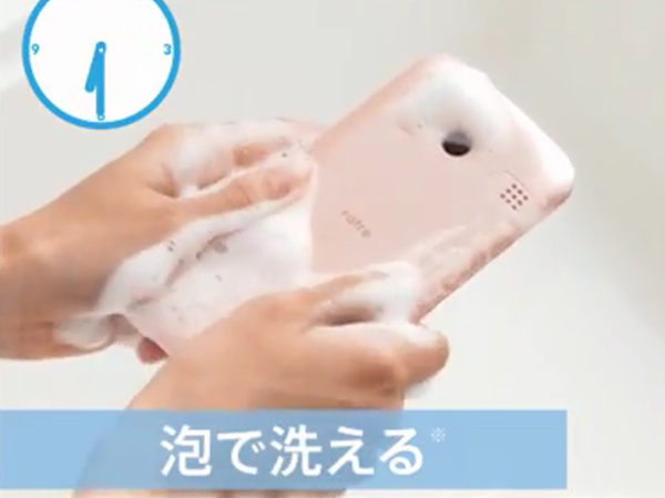 本機は、2015年12月に発売されたハンドソープで洗えるスマートフォン「DIGNO rafre」の洗える性能を強化したモデル。これまでは泡ハンドソープでの洗浄に対応していたが、泡ボディソープでも洗えるようになった。また、温水防水対応や濡れた状態でもタッチ操作が可能なので、お風呂でスマホの汚れを落としつつ、動画や音楽、SNSを楽しむといった使い方が可能。