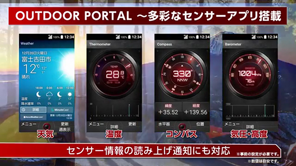ソフト面では、「TORQUE」シリーズで人気の「OUTDOOR PORTAL」を搭載し、アウトドアで必要な天気・温度・コンパス・気圧・硬度・天気予報・歩数・潮汐・魚の活性度の情報がすぐに入手できる。読み上げ機能もあり、携帯が圏外・圏内になった時の通知は登山者にとって非常に便利な機能だ。