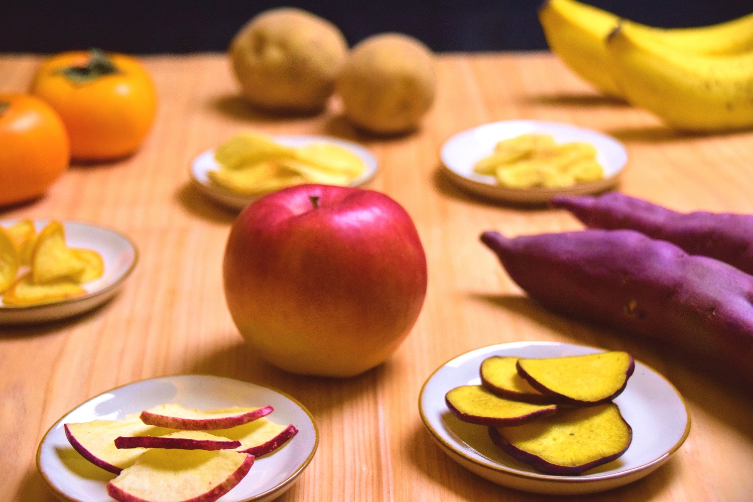 同商品は見た目にも可愛く、ちょっとしたお土産や贈り物にもおしゃれなフルーツチップス。昨年10月より発売されている「杵屋のやさいフルーツ」シリーズに、今回新たに「青森のりんご」「茨城のさつまいも」「山形のかき」「南国のばなな」の4種類が追加される。全て低温減圧フライという製法を用いており、焦げないうちにサクサクになるまで素材を乾燥、瑞々しい風味や香り、栄養素を残したままチップス状にする手法が採用されている。