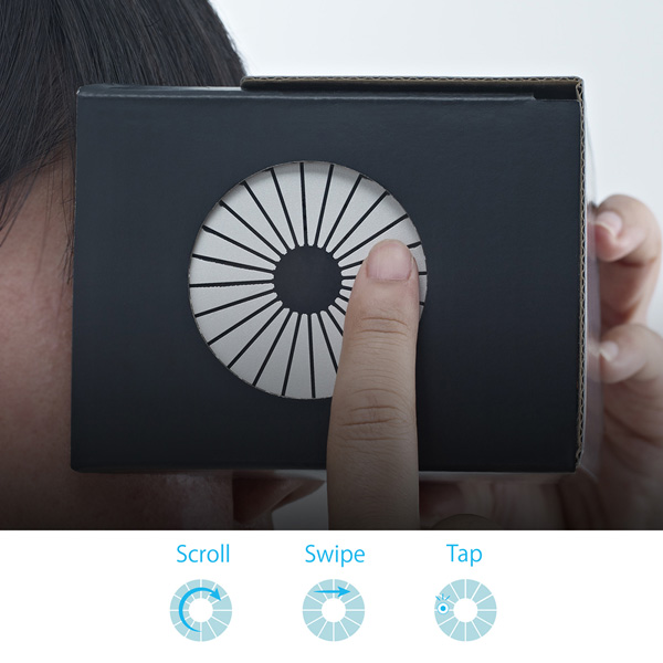 同製品は、タッチユーザーインターフェース搭載のダンボール製VRゴーグル。独自のタッチインターフェース、「Touch User Interface Module」によってゴーグル内のスマートフォンを、タップやスクロール、スワイプなどで操作できる。