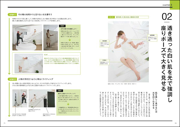 ちなみに同書は、ポージングの基本ポーズやルールとテクニック、シーン別ポージングのバリエーション、撮る前の準備やNG事項、美しく撮るための撮影の基礎といったライティングや技法などに加え、「女性をいかに美しく撮るか」に焦点を当てたところに、他の書籍にない独自性を持つ。