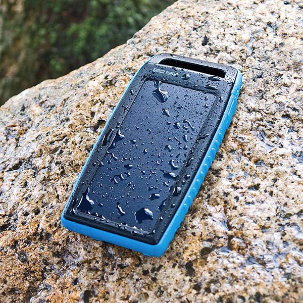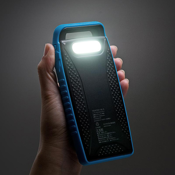 「サンワダイレクト」限定販売の本製品は、防水規格IPX4を取得しており、雨や汗などの水気に強い。外側は衝撃に強いプロテクターで覆われており、アウトドア用途にも適している。本体裏面には0.5WのLEDライトが用意されているため、非常灯として用いることも可能だ。