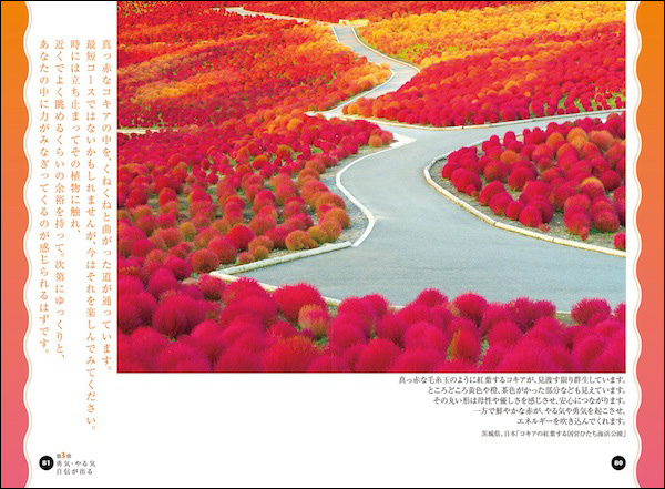 普段なにげなしに眺めている写真でも、カタチや色によって人の心はさまざまなことを感じ取るという、心理的要素に追求しているところがおもしろい。たとえば「なだらかで曲線的なカタチを見ていると、人の心はおだやかで平和な気持ちに変化する」「斜め上へと伸びていく線には、向上・成長・自由といったプラスのイメージ」「緑色には、自然・安らぎ・安全といったイメージ」「黄色は、温かさ・幸福・躍動・明朗・喜びといったイメージ」などなど、それぞれの写真には気分に対応する理由付けの解説が付いており、なるほどと思えることばかり。