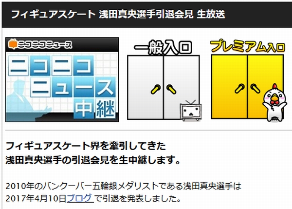 ニコニコ生放送、浅田真央選手の引退会見を本日4月12日11時30分より生中継