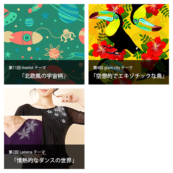 同Webサイトで第11回目の募集となる「merlot」ブランドでの今回のテーマは「北欧風の宇宙柄」。宇宙が必須要素とされ、北欧テキスタイル風の柄が募集されている。第4回目の募集となる「glam city」ブランドの今回のテーマは「空想的でエキゾチックな鳥」。南国に住む鳥のモチーフを用いたエキゾチックな柄のデザイン募集だ。第2回目の募集となる「Leirena」ブランドの今回のテーマは「情熱的なダンスの世界」。社交ダンスの衣装にビジューを用いてデコレーションするためのシルエットイラストの募集で、社交ダンスを連想させる曲線的なシルエットイラストが必須要素とされている。