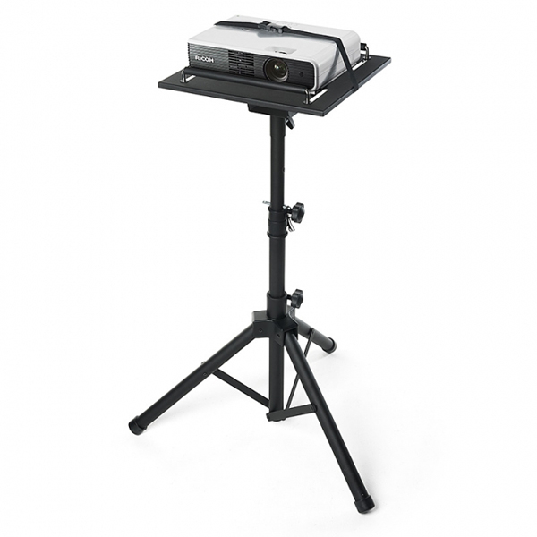 同製品は、プロジェクターやスピーカーを設置できる折りたたみ可能な三脚式マルチスタンド。プロジェクターの投影角度やスピーカーの位置などに合わせて、天板を左右に360度、上下に約30度、角度を調整できる。
