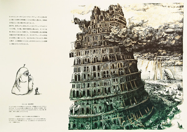 本書は、幻想的で怪異な作風で知られる画家ヒエロニムス・ボスと、「バベルの塔」を描いたピーテル・ブリューゲル1世、そして両者に影響を受けた16世紀ヨーロッパの画家たちの絵画・版画を元に、絵本画家ヒグチユウコが新たなる幻想世界を描き下ろした意欲作だ。