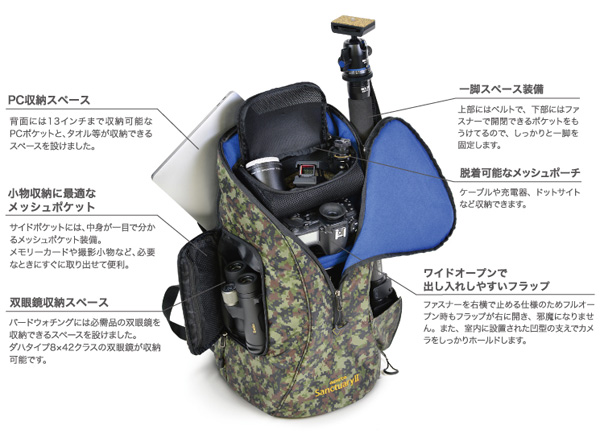 また、バードウォッチャーや、鉄道写真家、スポーツカメラマンなどの長時間利用を考え、リュック本体の重量を極限まで軽くしている。ブラックにはカモフラージュ柄の、カモフラージュ柄にはブラックのレインカバーが付属しており、雨天にも適応可能。出し入れしやすいワイドオープンタイプでありながら、室内に設置された凹部がしっかりとカメラをホールドするため、様々な環境で利便性の高い作りとなっている。