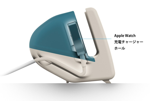 本製品は、まるでパソコンのディスプレイのようにApple Watchをセットしながら充電ができるドックスタンドだ。純正ケーブルをスタンド内部に嵌め込んで、背後までケーブルを通せるようになっており、Apple Watchを装着すると置時計のような形状になる。充電中は自動的にナイトスタンドモードに移行するため、文字盤も見やすく、目覚まし時計としても活用しやすい。