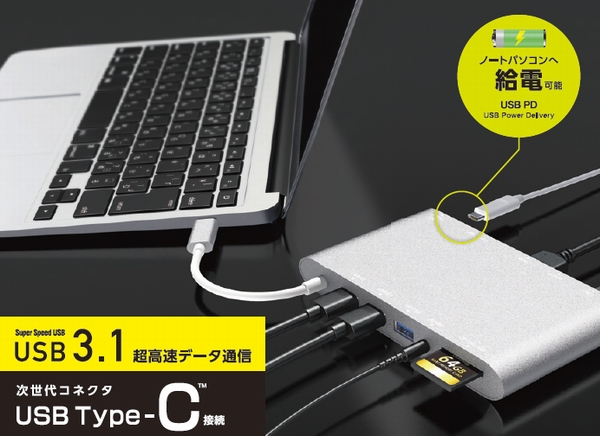本製品は、ノートパソコンとUSB Type-C接続することで、様々なデバイスを接続できるようにするドッキングステーション。「USB Power Delivery」に対応し、ドッキングステーションを通じてノートパソコンや各種デバイス電力を供給できる。