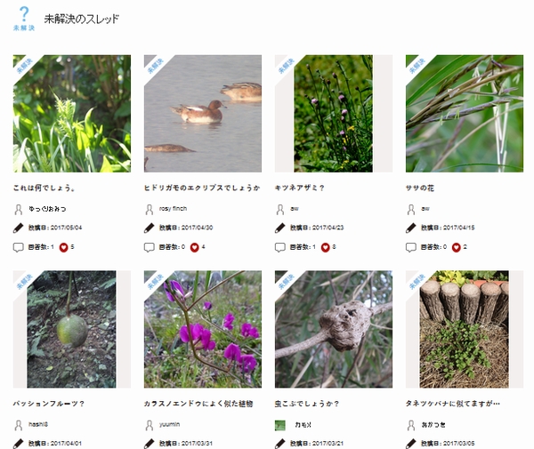 また、サイトでは読むだけではなく、ユーザー同士の交流機能も搭載。野鳥や植物の写真を投稿する「報告スレッド」、野鳥や植物の種類・名前などを質問できる「未解決・解決スレッド」があり、それぞれ、鳥好きや植物好きが集まり、野や森、川などで撮影した写真で交流している。