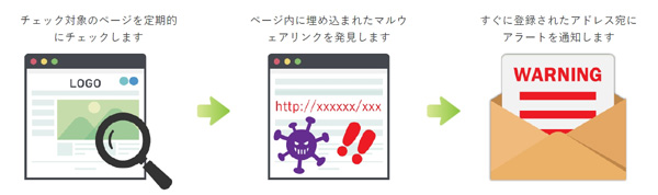 今回追加された「マルチウェアリンクチェック機能」は、悪意ある第三者に埋め込まれたマルチウェアリンクを素早く検知し、サイト訪問者が感染してしまうリスクを回避するのが目的だ。登録されたURL内のソースコードを定期的にスキャンし、最新のセキュリティデータベースと照合して、マルチウェアリンクの有無を確認。万が一、マルチウェアリンクが発見された場合は、すぐに登録されたメールアドレス宛にアラートが発信される。