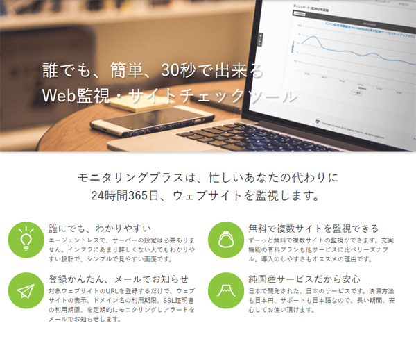 当サービスは、監視対象となるサイトのURLを登録するだけで、だれでも簡単にWeb監視・サイトチェックを始めることができるサービスだ。Webサイトの表示、ドメイン名の利用期限、SSL証明書の利用期限などを定期的にモニタリングし、問題があればメールで通知をしてくれる。