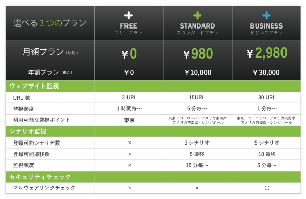 「モニタリングプラス」には、気軽に利用できる無料の“フリープラン”、画面遷移にともなうシナリオ監視・海外からの監視などにも対応した“スタンダードプラン”、さらに監視頻度やシナリオ登録数を増やした“ビジネスプラン”の3つの料金プランが用意されている。今回追加される「マルチウェアリンクチェック機能」は“ビジネスプラン”のみの対応となっているが、現在、新規登録者向けにトライアルキャンペーンを実施しており、初月無料で全機能の導入を試すことができる。