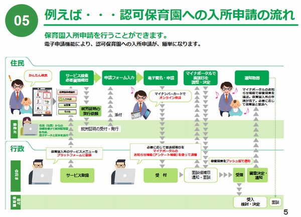 「LINE」との連携に関しては2017年中の開始を予定しており、例えば、LINEで検索して認可保育園の入所申請の電子申請などが可能になる。