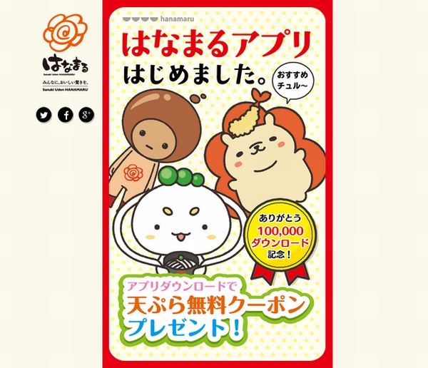 株式会社はなまるは16日、同社からリリースされた「はなまるうどん公式アプリ」(iOS/Android)の10万ダウンロードを記念して、「天ぷら一品無料クーポンプレゼントキャンペーン」をアプリ内で開催すると発表した。