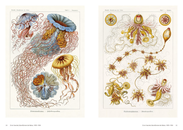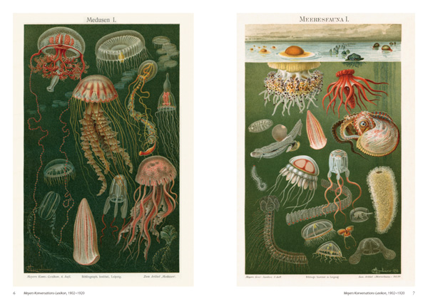 ドイツの生物学者ヘッケルが描いた緻密な生物画「クラゲ・プレート」をはじめ、19世紀半ばから20世紀初頭にかけて刊行された百科事典や図鑑の挿画が多数収録されており、写真では味わえない、深みのある色彩と緻密な描画が堪能できる。