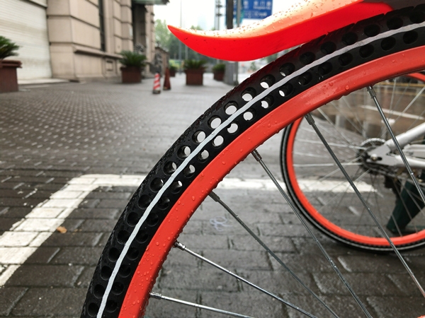Mobikeの自転車は穴が空いたパンクレスタイヤ(エアレスタイヤ)を採用し、整備にかかるコストも低減し、ユーザーが借りようとしたらパンクしていた、という不便さも解消している。