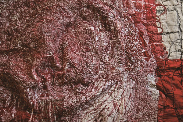 1963年埼玉県生まれの沖潤子氏は、セツモードセミナーを卒業し、企画会社勤務を経た後に自己流の刺繍を始めた。布が経てきた時間とその記憶に沖の針目を重ね合わせることで、偶然性をも含んだ“オブジェ”を創出。既存の刺繍や工芸などのジャンルにとらわれない独自の表現を探求しており、その作品は、まるで古布に新たな生を与えているかのような印象を与える。