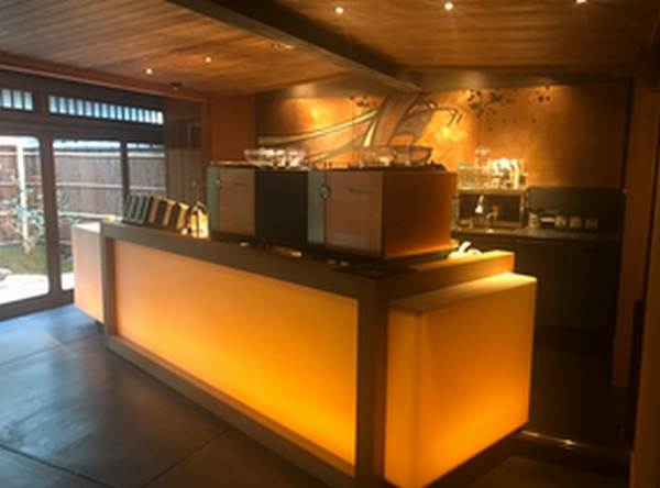 入り口にかかる藍染のような美しい藍色が特徴ののれんには、おなじみのスターバックスのロゴが描かれ、のれんを潜ると京都・東山花灯路を思わせる光がこぼれるカウンターや、縦に真っ直ぐ伸びる通り道のような空間が広がる。