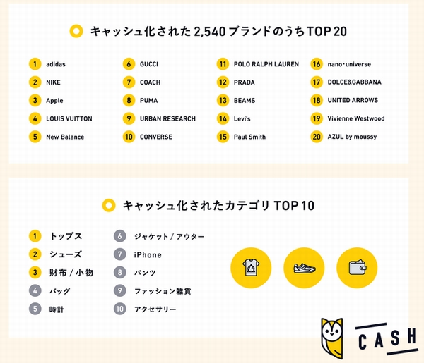 ほかにも、キャッシュ化されたブランドのトップはアディダスとナイキのスポーツブランドワンツーとなり、3位にApple、4位にルイ・ヴィトンが入っている。カテゴリではトップス、シューズ、財布/小物、バッグ、時計の順で、多種多様なアイテムを現金化していることがわかった。
