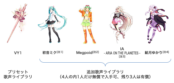 “歌声”は、初期状態ではシンガー「VY1」という歌声ライブラリが搭載されており、さらに専用アプリケーション(スマートフォン・タブレット対応)から、「初音ミク」を始めとするボーカロイドシンガーを追加することが出来る。現在用意されているボーカロイドは「初音ミク」「Megpoid」「IA」「結月ゆかり」の4人。最初の1人については無償だ。