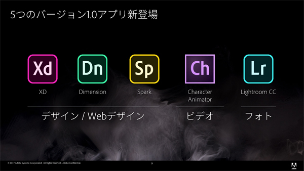 このほかにも、デザイン・プロトタイプ作成・共有までをデザインコミュニティ内で共有するUI/UXデザインツール「Adobe XD CC」、グラフィック、Webページ、ビデオストーリの作成などが直感的に行える「Adobe Spark CC」が正式リリース。