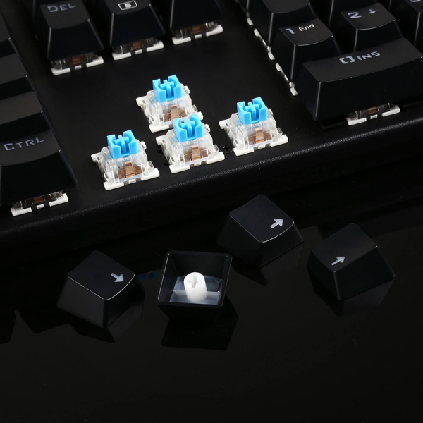 キーボード配列はスタンダードな104キータイプで、アンチゴースト機能の搭載により最大6キーの同時押しを素早く正確に認識。青軸構造でしっかりとした打鍵感を持ちながらも、タイピング時に指にかかる負担を軽減し、長時間入力でもストレスを感じることがない。